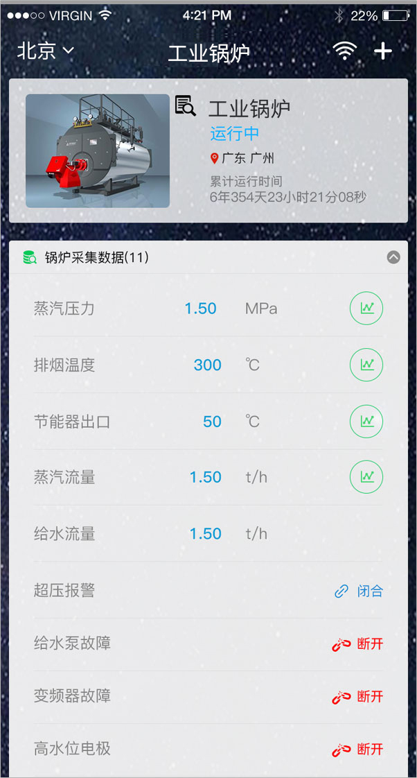5、 配網(wǎng)成功后,返回首頁(yè)并點(diǎn)擊剛才配網(wǎng)的設備,進(jìn)入該設備的鍋爐詳情頁(yè)面,查看鍋爐信息。